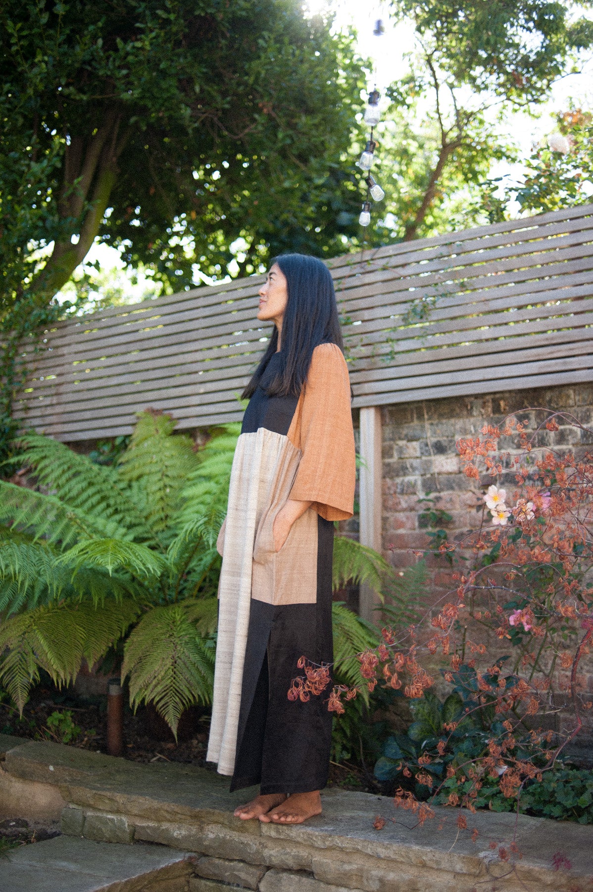 Eunice is wearing the Kelci Dress Patchwork #1 from AW19/20, and the Reversible Diamond Kimono PALE